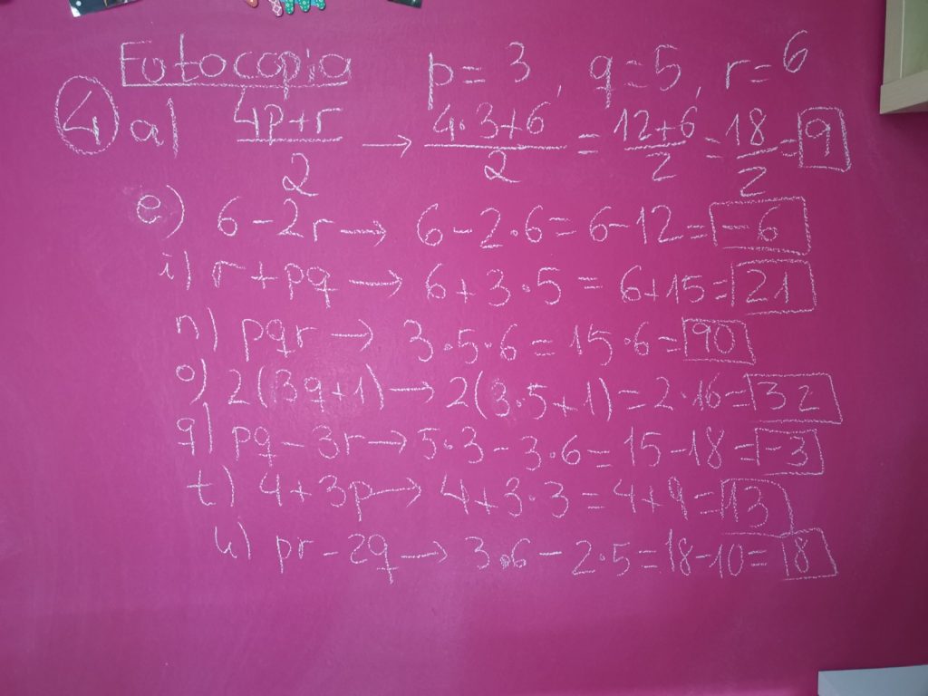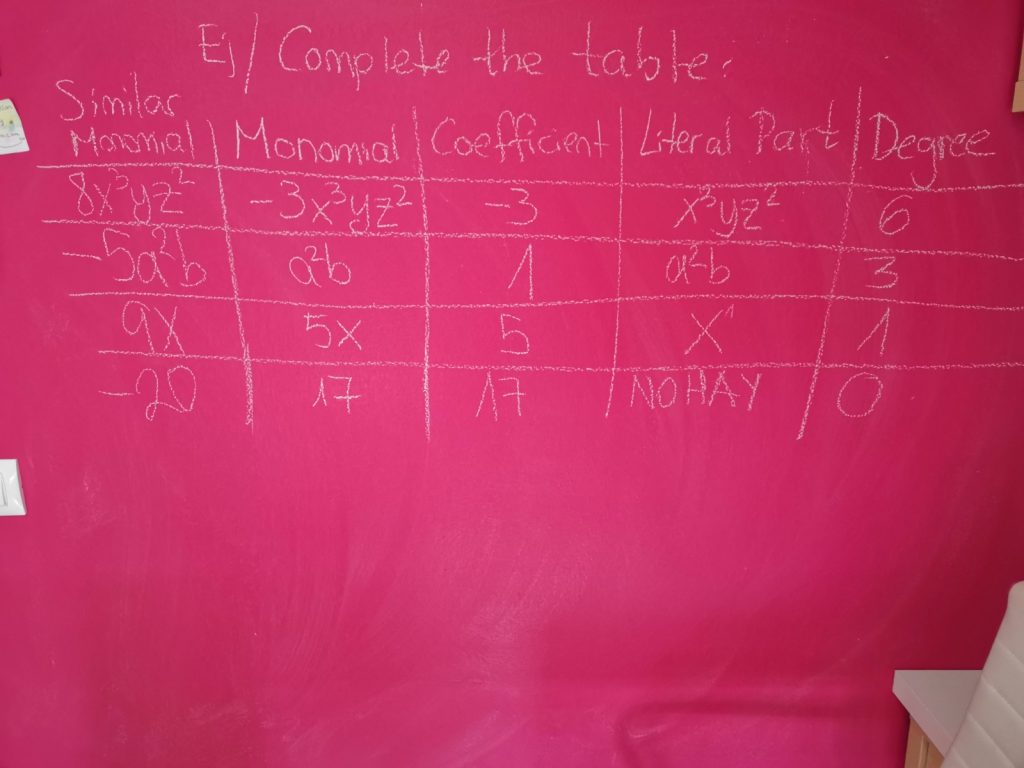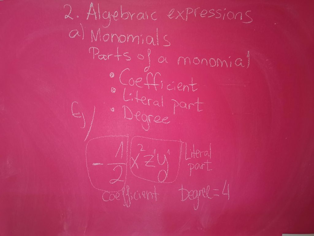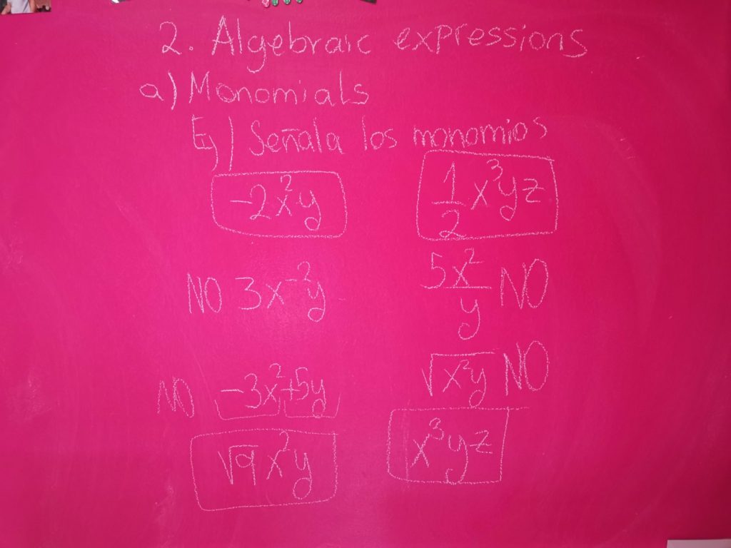 Clase virtual 20 abril (lunes) Marivi Contreras Martínez 20 abril, 2020 Sin comentarios Corrección de las siguientes actividades: Pág 171: 3, 4, 5, 6 Fotocopia: 4 Explicación: Punto 2: Expresiones algebraicas a. Monomios (definición, partes, monomios semejantes)