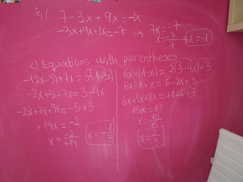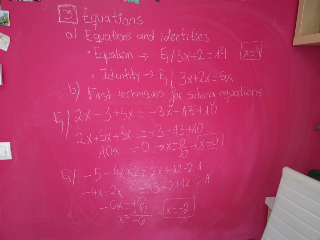 Clase virtual 7 de mayo (jueves) Marivi Contreras Martínez 7 mayo, 2020 Sin comentarios Corrección: Pág 175: 17, 18, 19 Fotocopia: 7, 10, 11def Explicación: 3. Equations 3a. Equations and identities 3b. First techniques for solving equations 3c. Equations with parentheses