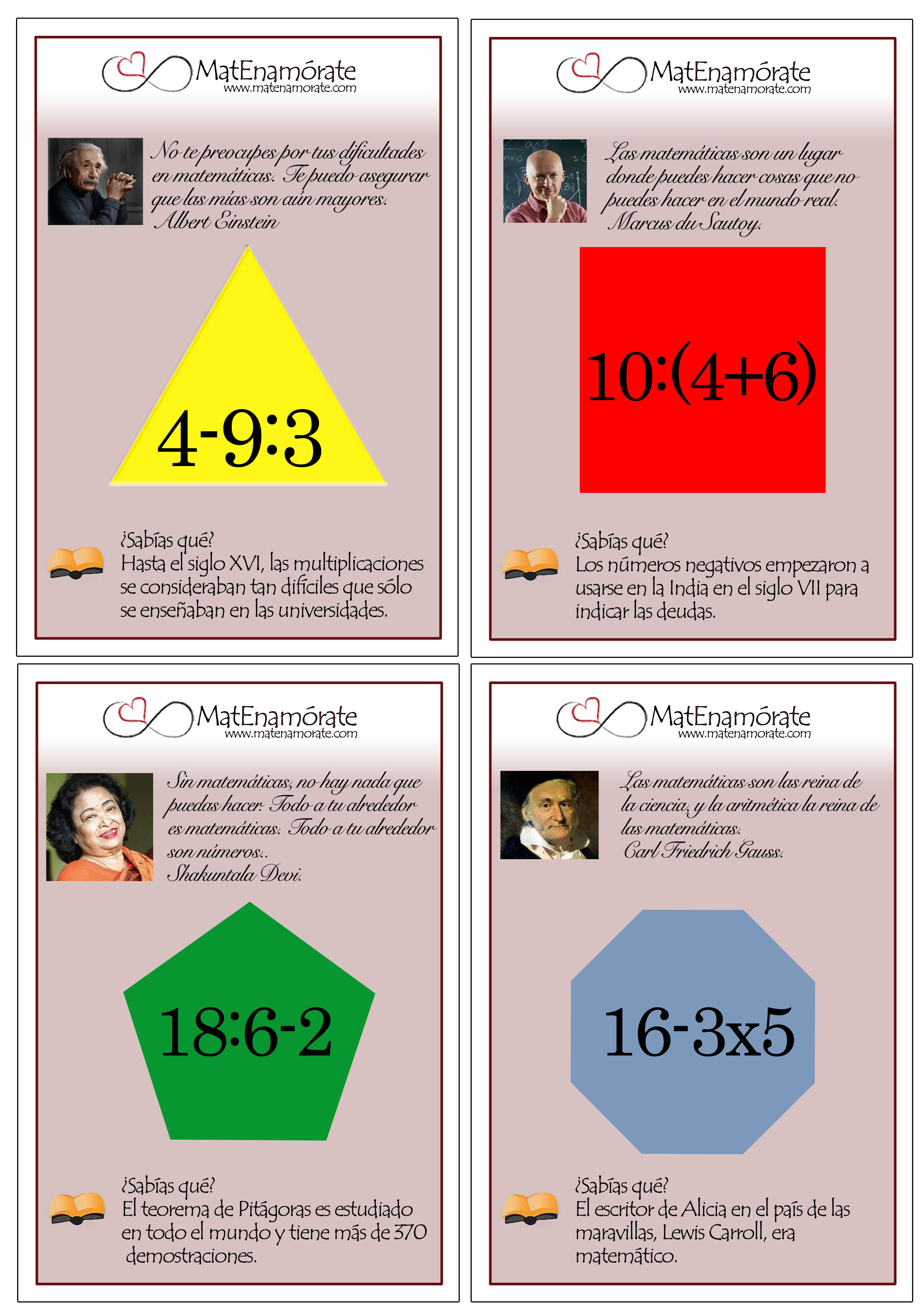 En primer lugar, se repartirán las tarjetas a los alumnos. Posteriormente, elegiremos qué característica de la figura geométrica va a regir la formación de los grupos: número de lados, color o resultado de la operación contenida en la figura.